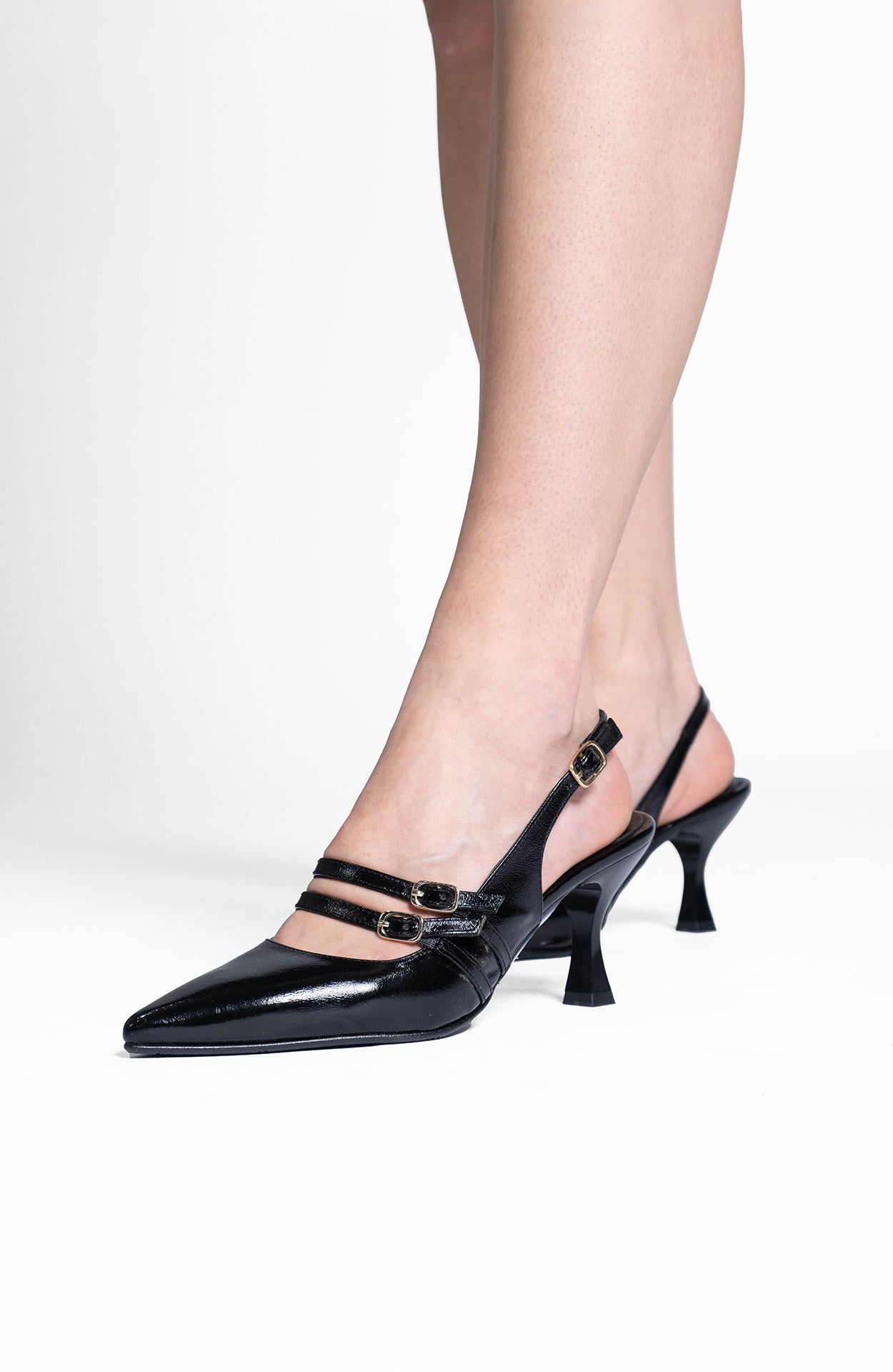 O design destaca tiras delicadas e o detalhe duplo na parte superior, que garantem um ajuste seguro sem comprometer a estética. O verniz resistente assegura um brilho duradouro e fácil limpeza, enquanto o salto proporciona estabilidade ao caminhar, refletindo uma construção de qualidade premium e uma silhueta que permanece atual ao longo das estações.