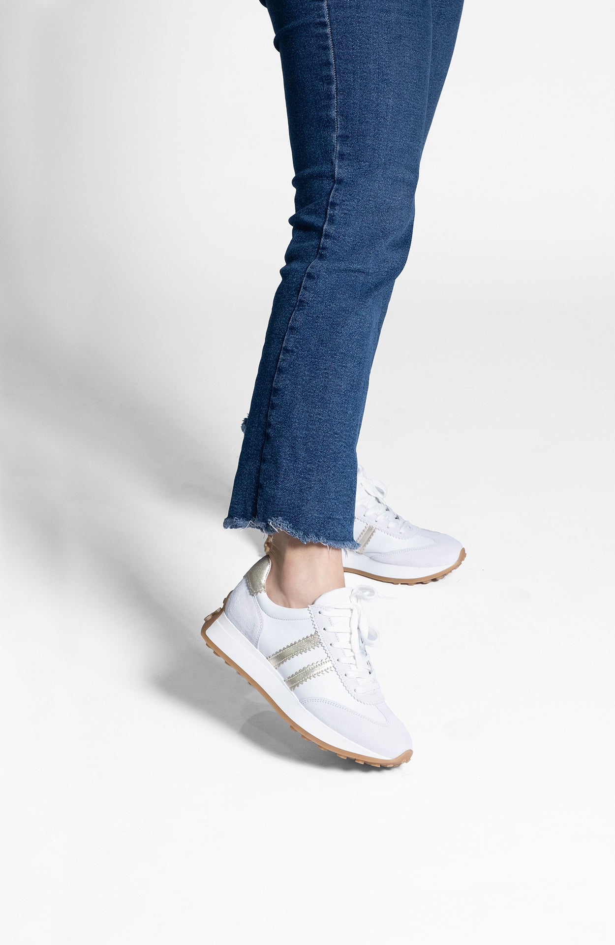 Especificações técnicas: Parte superior em pele branca com detalhes em ouro; Forro acolchoado; Sola de borracha antiderrapante; Fecho com atacadores; Cor predominante: branco com dourado.