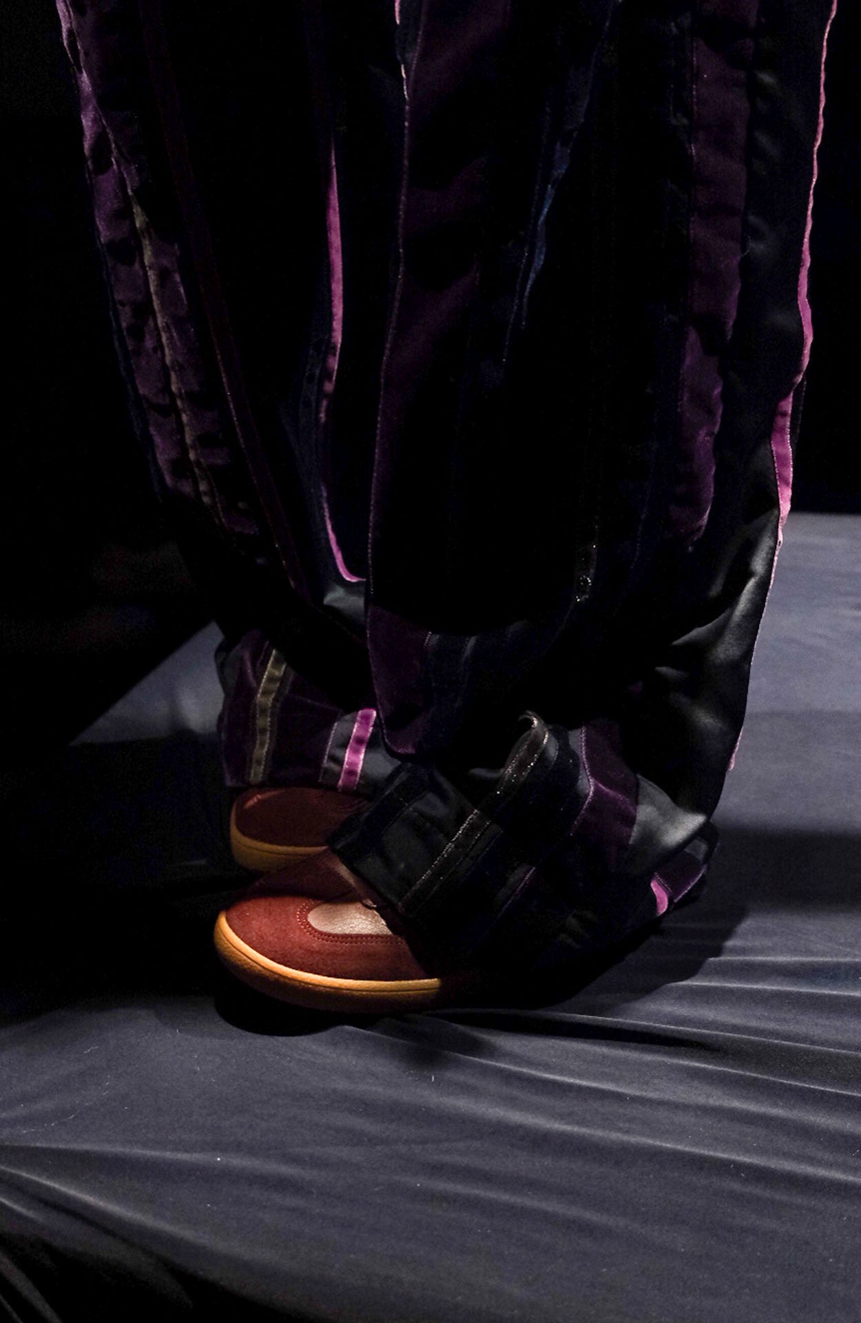 Sapatilhas exclusivas personalizadas pela estilista Constança Entrudo, usadas no ModaLisboa. Uma peça de edição limitada que celebra a união entre moda e arte.